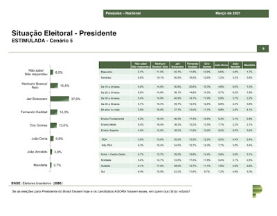 A pesquisa (íntegra – 533 KB) foi divulgada nesta 6ª feira (5.mar.2021). Foi realizada de 25 de fevereiro a 1º de março de 2021, por meio de ligações telefônicas. Foram consideradas entrevistas com 2.080 eleitores de 196 municípios, das 27 unidades da Federação. A margem de erro é de 2 pontos percentuais e o nível de confiança é estimado em 95%.