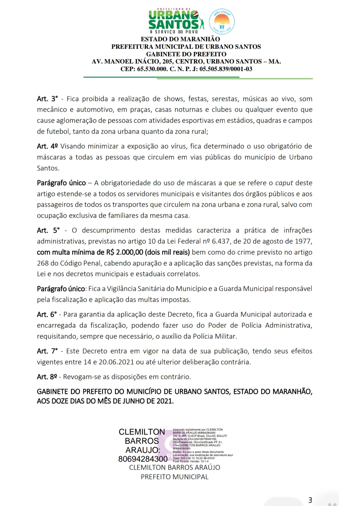COVID-19: EM URBANO SANTOS, PREFEITO EMITE NOVO DECRETO, MEDIDAS FORAM PRORROGADAS ATÉ O PRÓXIMO DIA 20