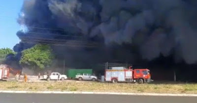 Uma sucata e uma empresa de reciclagem de borracha pegaram fogo na tarde desta quinta-feira (6), na BR 135, no Bairro Pedrinhas, em São Luís.